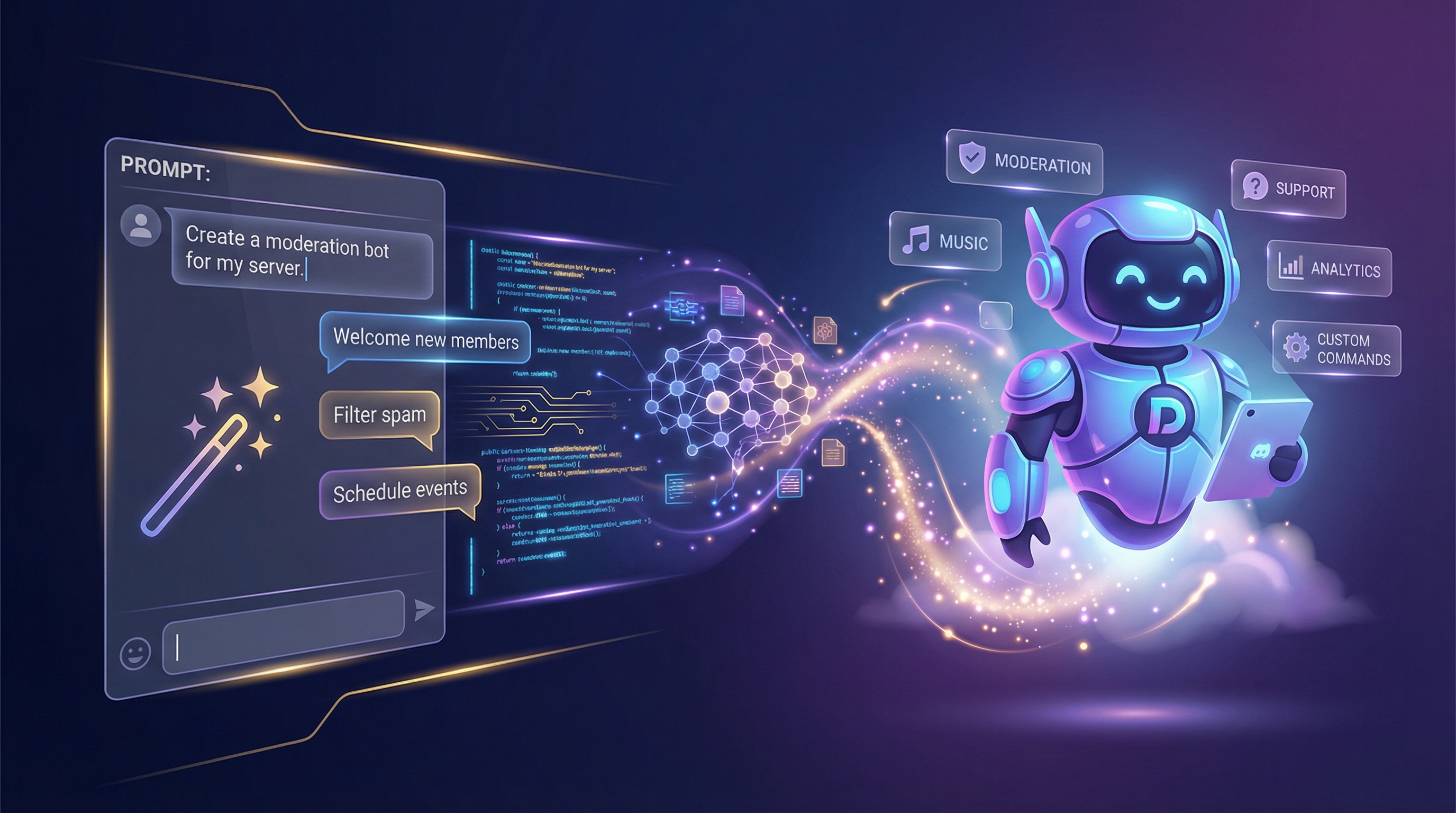 Building a Discord bot used to require weeks of learning JavaScript, Python, or another programming language. Understanding APIs. Debugging cryptic errors. Managing hosting.